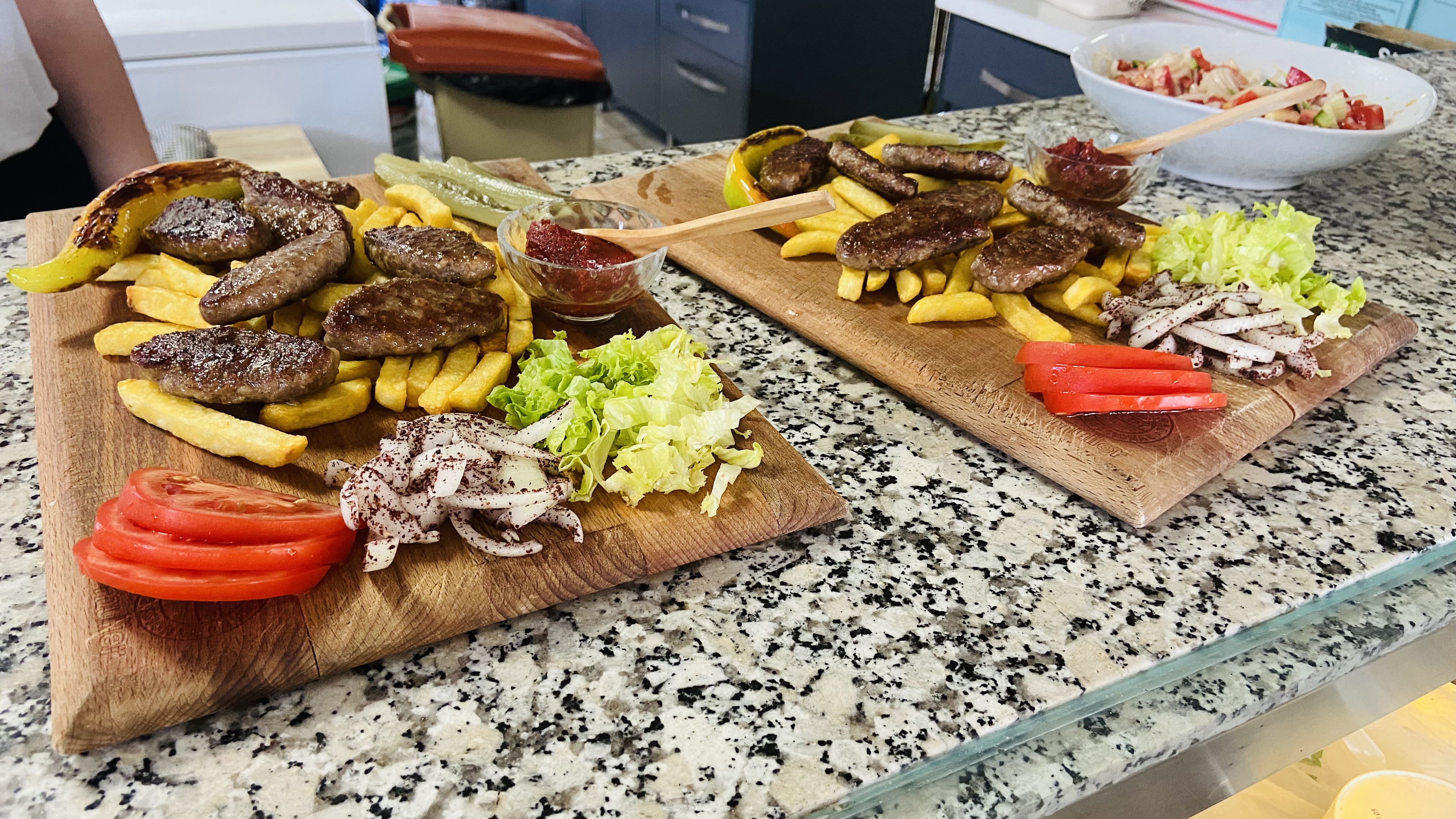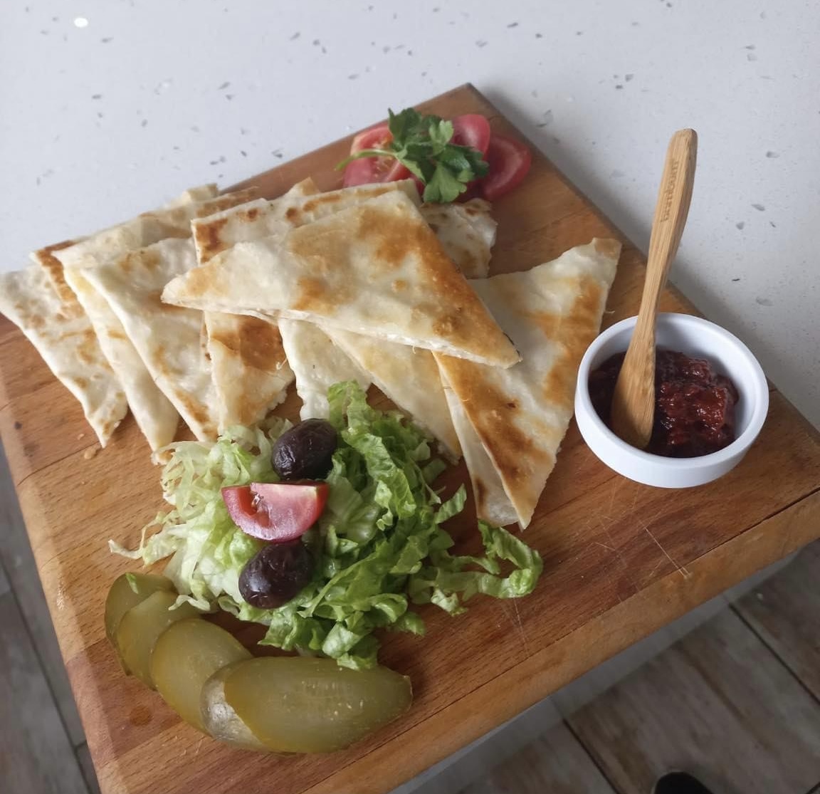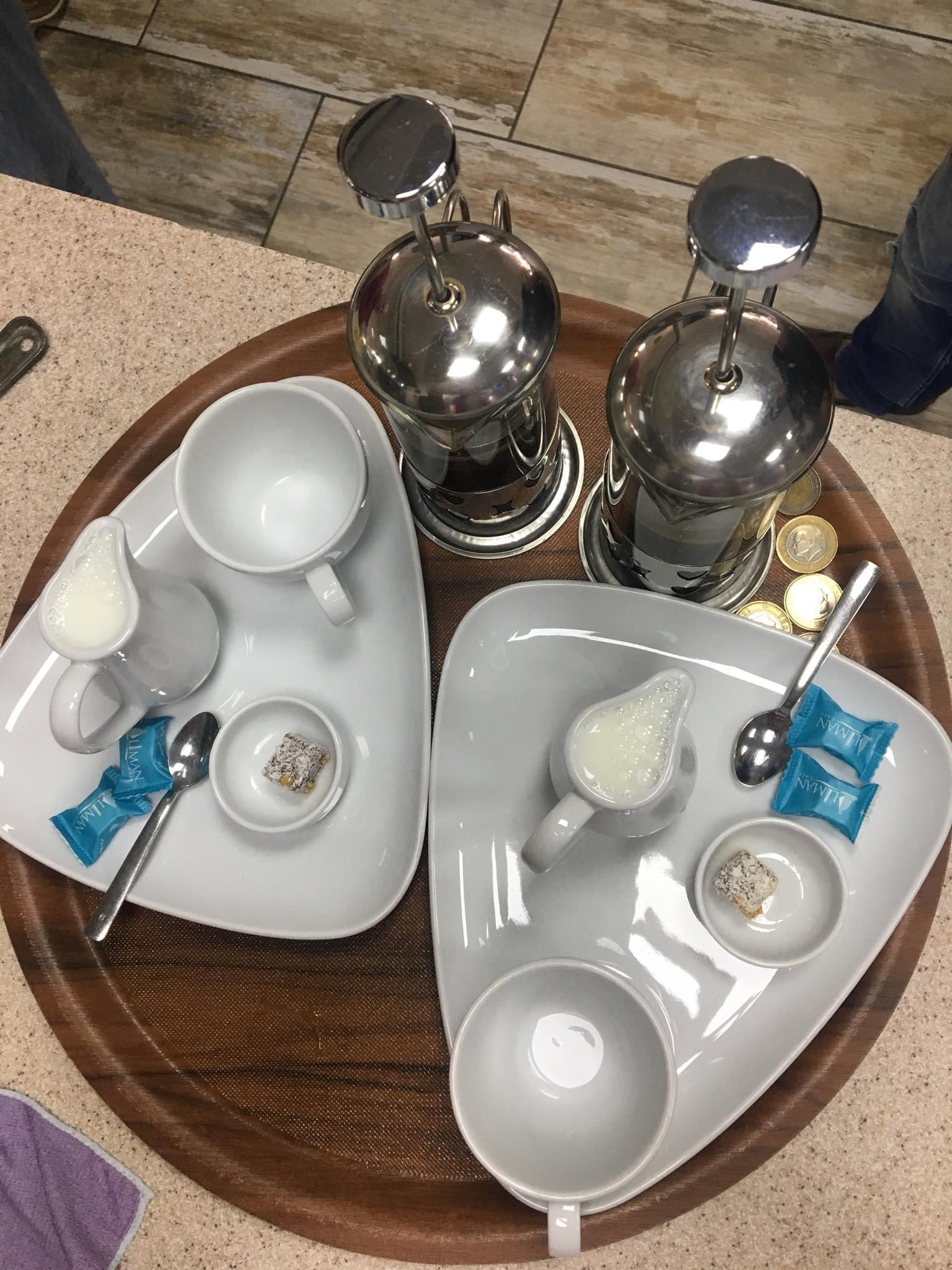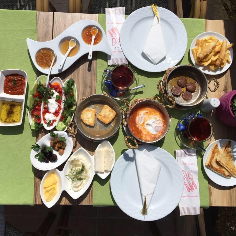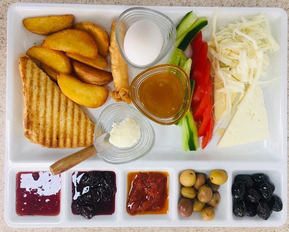 Vişne Reçeli, Çilek Reçeli, Bal, Kaymak, Zeytin Yağı, Tereyağı, Siyah Zeytin, Yeşil Zeytin, Kasap Sucuğu, Söğüş Tabağı, Ezine Peyniri, Tulum Peyniri, Çeçil Peyniri, Top Tane Peynir, Hellim Peyniri , Kahvaltı Salçası, Haşlanmış Yumurta,Sahanda Yumurta, Patates Kızartması, Siğara Böreği, Termos Çay